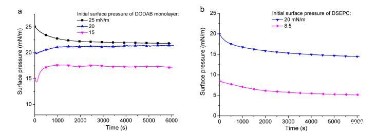 圖4.GO在不同表面壓力下對(duì)(a)DODAB和(b)DSEPC單層的吸附研究(表面壓力與經(jīng)過(guò)時(shí)間的關(guān)系)。首先將單層壓縮至純水亞相上的一定表面壓力,然后小心地將600μL 1 mg/mL GO分散液緩慢注入單層下方的水亞相。