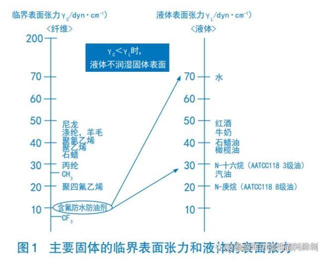 含氟整理劑之所以具有優(yōu)異的防水、防油、防污的性能,是因為含氟整理劑可使被整理織物表面具有非常低的表面張力,不僅低于水,而且低于各種有機(jī)液體,因而使其具有防水防油性。