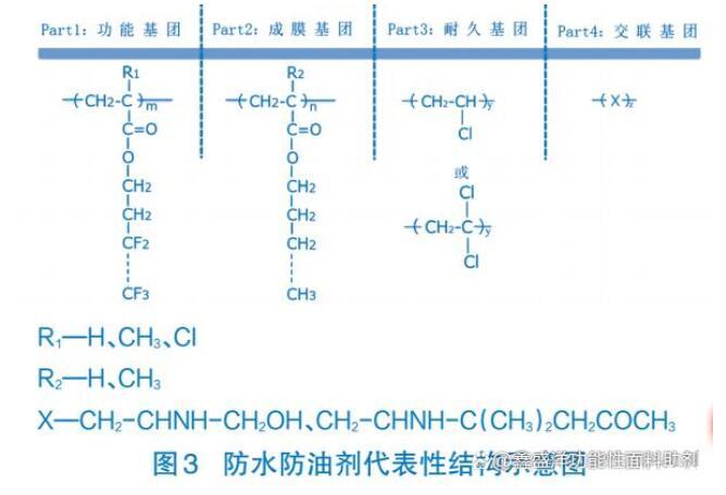 如圖3,其代表性結(jié)構(gòu)示意。其中功能基團(tuán)為含氟防水防油劑的主體,提供防水防油性;成膜基團(tuán)賦予成膜性、柔軟性;耐久基團(tuán)可賦予與纖維的接合性(特別是滌綸、尼龍)、耐磨性、耐洗滌性;交聯(lián)基團(tuán)根據(jù)自交聯(lián)和與纖維的交聯(lián),形成強(qiáng)韌的皮膜后,賦予耐久性等目的。