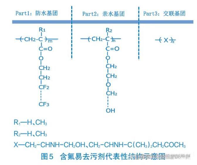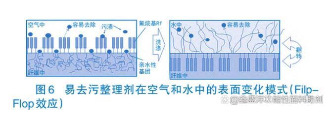 圖5為含氟易去污劑的主要結(jié)構(gòu)含氟易去污整理劑分子中既含有防水防油基團(tuán)——全氟烷基丙烯酸酯聚合物,又含有親水基團(tuán)——聚氧乙烯鏈等。織物經(jīng)整理后全氟烷基鏈段定向排列在纖維表面,排斥水性和油性污物,使其不易沾污。如果織物被污物沾附,在水洗液洗滌時,親水性鏈段定向排列在纖維與液體的界面上,吸引水分子,提高其易去污性能(也叫Filp-Flop,反轉(zhuǎn)凈洗效應(yīng))。織物水洗后烘干,親水鏈段脫水,氟烷鏈段重回其主導(dǎo)地位,再度呈現(xiàn)良好的防水防油性能。