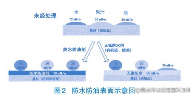 圖2中展示了,含氟防水防油劑通過降低纖維表面張力,達(dá)到優(yōu)異的防水防油效果。如通常棉的臨界表面張力為γc≈200 mN/m,而常溫下水、果汁、油的表面張力分別為72、50、30mN/m,所以棉很容易被以上液體潤濕。經(jīng)過含氟整理劑處理后,棉纖維表面張力下降至約10 mN/m,呈現(xiàn)出良好的防水防油性。而無氟防水劑本身的表面張力比較高,只能防水或者防部分水溶性液體(如牛奶、果汁等),達(dá)不到防油的效果。