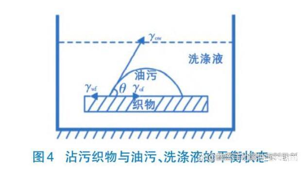 如圖4,從表面化學(xué)因素分析,要使油污易去除,紡織品必須有低的γwf(水-織物相的界面張力)和較高的γo(f油-織物相的界面張力),即紡織品必須具有高的親水性能。