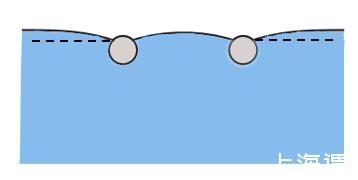 麥片圈效應(yīng)中使得麥片相互吸引的因素是麥片之間的橫向毛細(xì)力(Lateral Capillary Force),橫向毛細(xì)力可分為吸引力和排斥力,這里表現(xiàn)為吸引力。我們通過一個(gè)簡單的例子,來說明一下橫向毛細(xì)力產(chǎn)生的原因。首先考慮單個(gè)小球放置在液面上保持平衡,意即在重力的作用下對液面形成一個(gè)擾動(dòng),此時(shí)若液面上存在另外一個(gè)小球時(shí),這種擾動(dòng)會(huì)相互疊加,下圖中的液面便是最終的擾動(dòng)狀態(tài)。