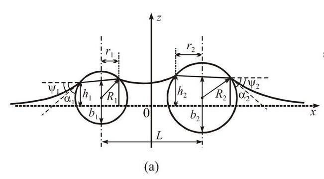 從能量的角度來看,液體表面能并不是由獨(dú)立放置單個(gè)小球時(shí)液面表面能的簡單相加,還要加上一項(xiàng)因另外一個(gè)小球存在時(shí)的相互表面能,其與小球之間的距離直接相關(guān)。這種相互表面能表現(xiàn)為沿小球連線方向的橫向毛細(xì)力。