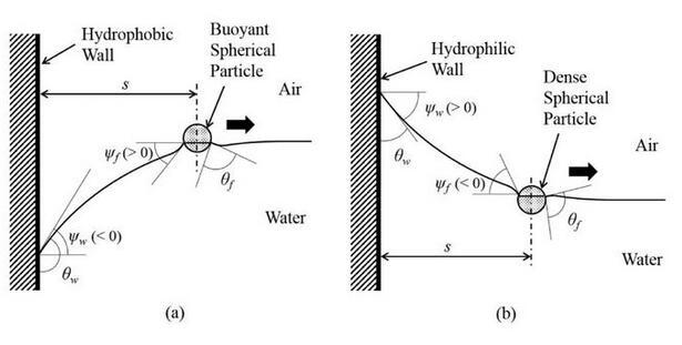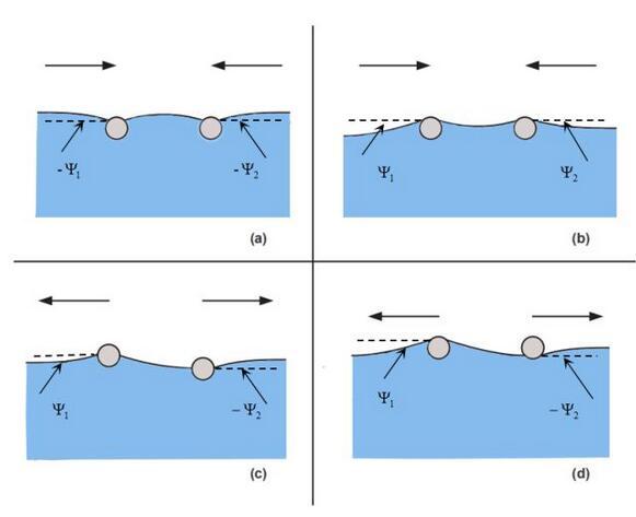 上圖便是水上兩個(gè)漂浮小球的吸引與排斥的判斷方法。值得注意的是,我們這里并沒有提及小球的浸潤性,也就是說,浸潤性與橫向毛細(xì)力的性質(zhì)并不直接相關(guān)。實(shí)際上,橫向毛細(xì)力還可以分為漂浮橫向毛細(xì)力和浸沒橫向毛細(xì)力。我們討論的情況是漂浮橫向毛細(xì)力,由小球的重力引起,題主的所說的浸潤性應(yīng)該換為小球的輕重(與水相比)。例如圖(a)里是兩個(gè)比水重的小球,表面張力將其往上拉。圖(b)是兩個(gè)比水輕的小球,表面張力將其往下拉。表面張力的方向恰好就對應(yīng)了前述接觸線處液面的傾斜角。題主的所要表達(dá)的意思其實(shí)是: