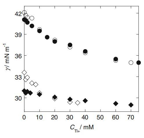圖6不同pH值下取決于Tl+摩爾濃度的界面張力(γ)曲線圖:pH=8.0時,SLAS的白圈3.0mm和黑圈4.0mm,pH=5.5時,SLAS的白圈2.5mm和黑圈3.5mm