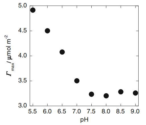 其中CS、R和T分別為表面活性劑總濃度、氣體常數(shù)和溫度。由于所有樣品溶液都含有過量的鈉鹽作為緩沖液并保持在恒定pH值,因此i值(濃度隨表面活性劑濃度變化的離子種類數(shù))取為1。圖5中繪制了最大值與pH值的關(guān)系圖。最大值在小于7.3的pH值下顯著增加,與cmc/C20比值的值相同。這些結(jié)果肯定表明,當pH值降至7.3以下時,在溶液表面用H+替換SLAS的Na+,也就是說,在pH值>7.3時,NDO癸酰基肌氨酸陰離子的反陽離子(LAS?)是空氣-水界面處的所有Na+。因此,估計了H+LAS的pKa值?另一方面,在含水體中,我們根據(jù)不同SLAS濃度下的pH值,確定了含水體相中HLAS的pKa值為3.3,該pH值在氮氣鼓泡的去火純水中。雖然我們還無法確定組裝的HLA的確切pKa值,因為尚未獲得HLA的最大值,但毫無疑問,其值大于含水體相中HLA單體的值3.3。一些文獻也報道了自組裝過程中pKa值的增加[12,13]。