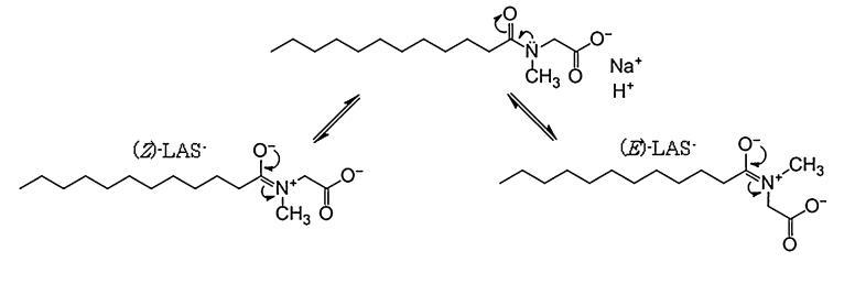 Bordes等人研究了氫鍵對甘氨酸鹽和肌氨酸鹽自組裝的影響[17]。Gad等人研究了具有不同碳鏈長度的N-酰基肌氨酸鹽的界面張力[3]。還對含有SLA的二元混合物與Gemini表面活性劑[18]和陽離子聚合物[19]進行了一些界面研究。然而,這些研究沒有考慮它們的pH影響。Tsubone等人在pH值為10.5[20]時對SLA進行了界面張力測量。然而,SLAS水溶液的界面張力在很大程度上取決于pH,在膠束前和膠束后區(qū)域中,當pH小于約7時,其值顯著下降。cmc和C20在較低pH下也會降低,但cmc/C20比在pH<7.3時增加。該比值的增加通常意味著親水頭的尺寸增加和/或與反陽離子的締合增加。在pH<7.3時,Γmax也急劇增加。這些結(jié)果清楚地表明,在空氣-水界面的較低pH區(qū)域,SLA的Na+陽離子被H+取代。向溶液中加入Tl+,證實LAS的界面張力?并且它們以H+<Na+的順序增加,這與這些結(jié)果一致。此外,我們使用1H-NMR和13CNMR研究了D2O和CD3OD中HLA和SLA的結(jié)構(gòu)差異。根據(jù)這些結(jié)果,例如,來自LAS親水部分中1小時的所有信號?可以想象,HLA和SLA都具有共振結(jié)構(gòu),(Z)-LAS?和(E)-LAS?,如圖9所示。通過NMR[21,22]的膠束化也報告了這些SLAS異構(gòu)體的存在。根據(jù)分裂峰的積分比,Z/E形式的豐度比確定為SLA為1:1,HLA為2:1。由于E型比Z型體積大,這可能是Γmax隨pH值增加而減小的第二個原因,直到pH值為7.3。另一方面,除了RB的各向異性(在pH<7時明顯增加)外,含水體中的膠束性質(zhì)對pH的依賴性小于界面性質(zhì)。然而,在pH值降低時,聚集數(shù)和流體動力學(xué)半徑的小幅度增加趨勢以及膠束核的微極性的減小趨勢可以很好地解釋為LAS親水性頭基團之間的靜電力減小?由Na+到H+的反陽離子置換引起,與界面性質(zhì)的情況相同。雖然我們尚未確定界面和膠束中HLA的pKa值,但這些值應(yīng)大于水溶液中的pKa值(pKa,bulk=3.3);界面處的值可能略大于膠束中的值。pH<7時體積較小的Z型的增加也與膠束性質(zhì)相容,并可能與膠束親水部分附近RB各向異性的增加直接相關(guān)。