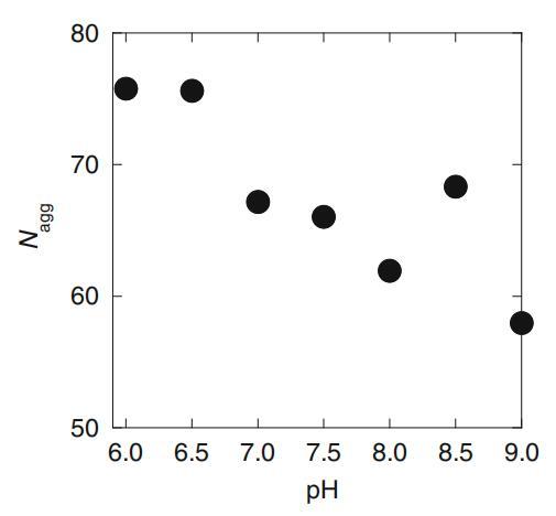 為了評估膠束(Nagg)的聚集數(shù),我們使用帶有猝滅劑(HPYL)的探針(Py)的穩(wěn)態(tài)熒光猝滅方法[8]。已發(fā)現(xiàn)該探針-猝滅劑對適用于評估幾種膠束系統(tǒng)的Nagg[14,15]。Cs=25 mM時的評估Nagg值如圖7所示。如圖所示,Nagg數(shù)值總體上隨著pH值的增加而降低。然而,似乎在pH 6.5-7附近也存在一個斷裂點。如果是這樣,膠束中HLA的pKa預(yù)計在6.5到7.0之間,這也比水溶液中的pKa大,就像空氣-水界面的結(jié)果一樣。為了進行進一步討論,我們需要更精確地確定這些Nagg值。