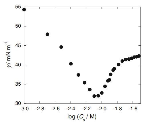 通過測量磷酸鹽和硼酸鹽緩沖液水溶液中的界面張力、熒光、動態(tài)光散射等,研究了陰離子表面活性劑正十二烷基肌氨酸鈉(SLAS)的pH依賴性。SLAS的界面張力(γ)隨著pH值的降低而顯著降低,并在pH>7.3時保持恒定。臨界膠束濃度(cmc)和表面活性劑濃度(在其γ值比純水(C20)降低20 mN/m時)的觀察值隨著pH值降低而降低,而在pH>6.5和>7.3的情況下也分別保持恒定。另一方面,當pH<7.3時,SLAS的界面過量增加。通過添加取代SLAS的Na+的Tl+進一步研究了這些界面行為。LAS的觀測γ值?考慮到靜電相互作用和親水性頭基的分子結(jié)構(gòu),詳細討論了這些界面和膠束性質(zhì)。