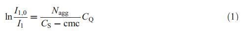 為了通過穩(wěn)態(tài)熒光猝滅法評估膠束的平均聚集數(shù)(Nagg),使用芘作為熒光探針,選擇HPYC作為靜態(tài)猝滅劑[8]。該方法基于已知濃度的猝滅劑對發(fā)光探針的猝滅。通過使用以下等式[8]分析淬火實驗: