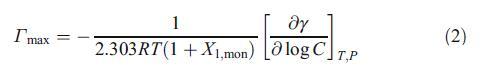 其中γ、C、R、T、P和X1、mon分別為界面張力、表面活性劑濃度、理想氣體常數(shù)、溫度、壓力和陽離子表面活性劑(HTPB)的單層組成。在等式2中,我們考慮了界面處反離子的吸附,以計(jì)算Γmax。界面上表面活性劑物種占據(jù)的平均最小面積Amin然后通過以下方程進(jìn)行評(píng)估: