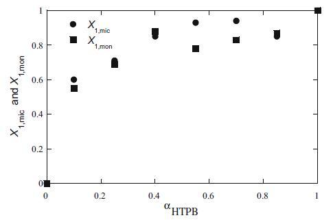 圖3 HTPB+Mega-10混合體系的膠束(X1,mic)和單層(X1,mon)組成與αHTPB的關(guān)系圖