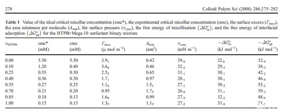 在這項(xiàng)工作中,我們給出了純HTPB和Mega-10及其不同比例的二元混合物的實(shí)驗(yàn)結(jié)果。首先,我們進(jìn)行了界面張力測量,以確定HTPB+Mega-10純混合物和二元混合物的混合cmc和界面熱力學(xué)參數(shù)。根據(jù)不同的熱力學(xué)模型分析了混合cmc的數(shù)據(jù)。其次,進(jìn)行穩(wěn)態(tài)熒光測量,以確定膠束的聚集數(shù)和極性,以及它們的斯特恩-沃默結(jié)合常數(shù),取決于溶液組成。最后,我們研究了羅丹明B(RB)的極化,以監(jiān)測不同HTPB摩爾比下混合膠束的剛性。