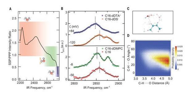 綜上所述,疏水油滴接觸界面水結構的特征是水和油分子之間的電荷轉移相互作用,這種電荷轉移作用源于非常規(guī)的C-H···O H鍵。與平面氣-水界面相比,油滴表面的水具有更強的H鍵網絡。界面O-D和C-H的光譜位移為水向油的電荷轉移提供了證據,解釋了裸油滴在水中的負電荷和穩(wěn)定性。