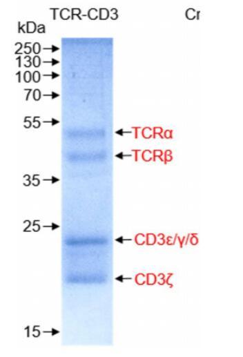 膜蛋白復(fù)合體TCR-CD3交聯(lián)后進(jìn)行凝膠過濾分子篩層析,進(jìn)行SDS-PAGE實(shí)驗(yàn),發(fā)現(xiàn)得到比較純的復(fù)合體。