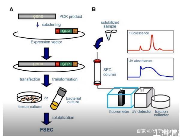 FSEC用于表達(dá)條件和去垢劑的快速篩選。FSEC(Fluorescence-Detection Size-Exclusion Chromatography),又叫熒光檢測尺寸排阻色譜法。具體方法是將目的基因構(gòu)建在帶有GFP標(biāo)簽的融合表達(dá)載體上,進(jìn)行小量表達(dá)。通過不同的去垢劑溶解后,然后上樣微量色譜柱,使用AKTA系統(tǒng)的紫外,熒光檢測器進(jìn)行檢測(熒光檢測器需搭配)。由于目的蛋白帶有GFP標(biāo)簽,使用熒光檢測會顯示出熒光信號。通過峰型和峰面積我們可以檢測到蛋白表達(dá)和溶解情況。