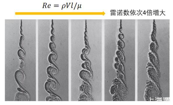 隨著雷諾實驗和雷諾數(shù)被提出來以后,近代流體力學,尤其是湍流理論的發(fā)展出現(xiàn)了一個前所未有的盛況,而粘性與湍流的關系也順理成章的轉化成了雷諾數(shù)和湍流的關系。1974年刊登于《流體力學》期刊中的一篇經典文章,通過流動顯示技術生動形象的描繪了雷諾數(shù)和流態(tài)的關系:隨著雷諾數(shù)的增大,渦旋的整體形狀和尺度基本一致,然而射流摻混的渦系結構卻越來越豐富。