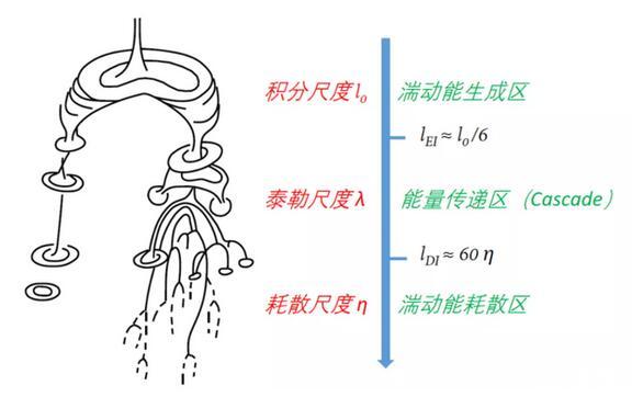 而之所以會出現(xiàn)上圖中的有趣現(xiàn)象,則要牽扯到湍流的生成、傳遞及耗散:湍流中的大渦會破碎為小渦,小渦再破碎為更小的“迷你渦”,然后逐漸耗散,這個過程與當?shù)乩字Z數(shù)相關。當“迷你渦”變得足夠小時,根據(jù)角動量守恒,渦的角速度將會非常大,意味著局部速度剪切很強,粘性就變得舉足輕重了,于是,“迷你渦”就這樣被粘性耗散掉了。事實上,渦的尺度足夠小時,體現(xiàn)為當?shù)乩字Z數(shù)非常小,粘性力對流體的影響則顯著大于慣性力。