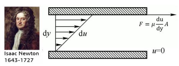 正如前面所說,人們很早便感受到了流體具有“粘”的屬性,但是如何從科學上表達流體的粘性成為了一個新的問題。作為世界物理學界金字塔尖的男人,牛頓幾乎霸屏了整個中學物理課本,當然也沒有放過流體。1686年,牛頓經過大量的實驗研究,提出了著名的“內摩擦定律”——流體的內摩擦力(即粘性力)的大小與流體的性質(粘性系數(shù)μ)有關,并與流體的速度梯度和接觸面積成正比。