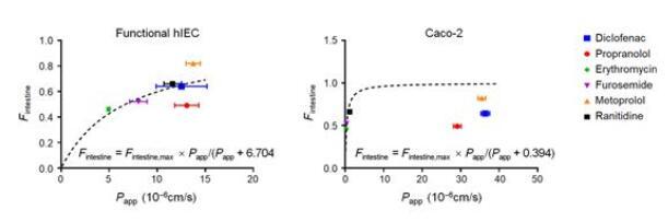 隨后,研究分析了各種腸道轉(zhuǎn)運體和代謝酶的表達水平,通過RNA測序與酶活性檢測,發(fā)現(xiàn)腸道堿性磷酸酶(IAP)和CYP3A4在功能性hIEC中表達量相當(dāng)高,這些結(jié)果表明功能性hIEC具有藥物轉(zhuǎn)運體和藥物代謝酶活性,是評價藥物體外生物利用度所必需的。本研究使用了6種臨床藥物:美托洛爾、普萘洛爾、雙氯芬酸、雷尼替丁、呋塞米和紅霉素,進行體外藥物吸收試驗,發(fā)現(xiàn)與Caco-2模型不理想的體內(nèi)外相關(guān)性相比,功能性hIEC與已公布的人體內(nèi)腸道吸收數(shù)據(jù)擬合的相關(guān)性良好,說明功能性hIEC可以更好地預(yù)測人的口服生物利用度和吸收程度。