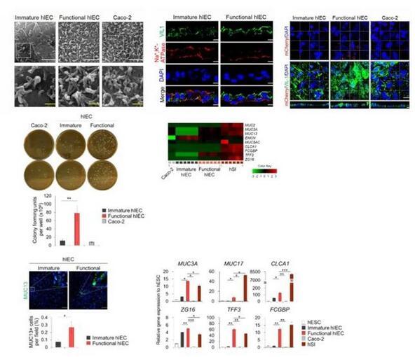 由于在hSI中,Wnt的抑制和Notch的激活有助于祖細胞分化為吸收前上皮細胞,研究者使用了Wnt信號抑制劑Wnt-c59和Notch信號激動劑丙戊酸(VPA),來進一步將hIEC祖細胞分化為與體內(nèi)類似的成熟且有功能的hIEC。與其他僅由吸收性腸細胞組成的小腸上皮模型相比,該系統(tǒng)可以模擬體內(nèi)樣腸組織進行研究。與未成熟的hIECs相比,功能性hIECs形成了一個結(jié)構(gòu)極化的單層,并觀察到了類似杯狀細胞分泌出的粘液。此外,功能性單分子層hIEC的頂表面接觸的細菌數(shù)量明顯更高,并且黏液蛋白和黏液蛋白相關(guān)基因的表達在功能性hIEC中顯著增加能夠允許腸道微生物群的持續(xù)定植。