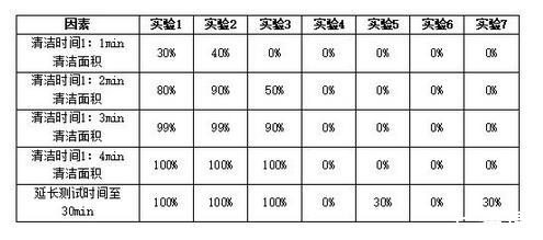 通過實(shí)驗(yàn)1我們發(fā)現(xiàn):在浸泡清洗中各組分均能達(dá)到較好的清潔效果,但各組分最終清潔時(shí)間有差異,具體數(shù)據(jù)如下表