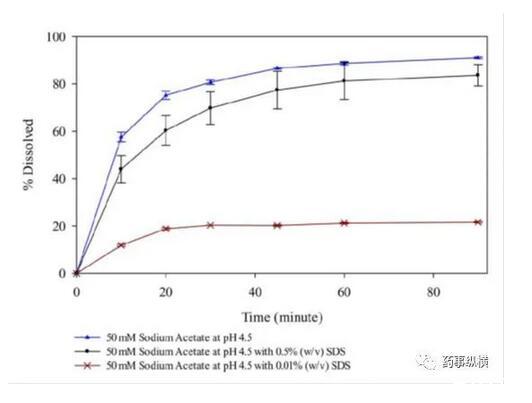 通常在確定要加入表面活性劑之前,應(yīng)進(jìn)行以下研究,證明制劑在截止時(shí)間內(nèi),藥物在所有溶出介質(zhì)中平均溶出量均達(dá)不到85%,如果有一種溶出介質(zhì)達(dá)到85%以上則可以不必考慮使用表面活性劑。