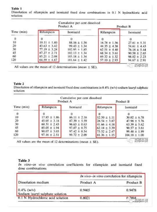 利福平與異煙肼復(fù)方制劑在進(jìn)行溶出曲線(xiàn)測(cè)定時(shí)發(fā)現(xiàn)利福平在0.1N鹽酸中不穩(wěn)定,發(fā)生降解。由于利福平在水中不溶,因此采用了0.4%SDS溶液進(jìn)行了研究,結(jié)果表明在整個(gè)分析檢測(cè)過(guò)程中無(wú)降解。而且,0.4%SDS溶液的體內(nèi)外相關(guān)性很好。