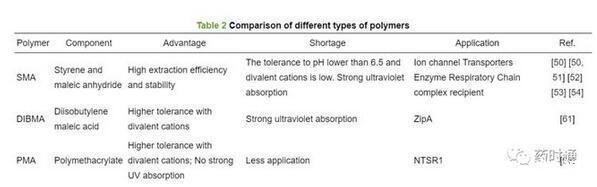盡管SMA和DIBMA在一些MPs的分離純化中取得了成功[63],但存在SMA對二價陽離子耐受性低、DIBMA提取純度和穩(wěn)定性低的缺陷并且這兩種聚合物都有強烈的紫外吸收,可能干擾紫外檢測[57]。因此人們開始尋找非“烯烴-馬來酸支架”替代聚合物。最近,兩親性聚甲基丙烯酸酯聚合物(polymethacrylate,PMA)被證明可將脂質(zhì)雙分子層溶解成納米圓盤。PMA比常見的苯乙烯-馬來酸聚合物具有潛在的優(yōu)勢,但目前PMA對于MPs的純化應(yīng)用較少[64]。Lavington等[63]以神經(jīng)緊張素受體1(NTSR1)為對象,探索使用PMA的無洗滌劑純化。通過使用Sf9細(xì)胞中表達(dá)的NTSR1-eGFP融合蛋白,篩選了一系列的增溶條件,證明了溫度、pH、NaCl濃度以及聚合物和膜樣品的相對數(shù)量的重要性。此外還發(fā)現(xiàn)PMA對二價陽離子有一定耐受性。PMA溶解的NTSR1比洗滌劑溶解的NTSR1表現(xiàn)出更大活性,這表明PMALPs為NTSR1提供了更天然的膜環(huán)境[63]。因此,PMA是一種可替代SMA的MPs純化方法,在研究NTSR1和其他MPs方面具有良好的前景。表2比較了SMA、DIBMA、PMA的組成、優(yōu)缺點及其應(yīng)用。