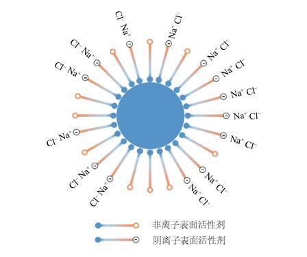 抑塵劑主要由陰離子表面活性劑、非離子表面活性劑以及其他助劑組成。其中,表面活性劑是一種具有兩親性的物質(zhì),加入少量能使其溶液體系的界面狀態(tài)發(fā)生明顯變化,是抑塵劑的重要組成部分。如圖4所示,煤塵表面暴露著大量的極性有機基團(tuán),水在煤塵表面很難發(fā)生潤濕行為;抑塵劑中的表面活性劑親油端與煤塵表面的有機基團(tuán)具有較好的相容性,能夠在煤塵表面定向排列并且將親水基團(tuán)引入煤塵表面,增加了水與煤塵之間的潤濕能力。無機鹽的引入對于陰離子表面活性劑具有增效作用。根據(jù)雙電層理論,雙電層可以分為緊密層和擴散層,當(dāng)溶液中加入無機鹽后,無機鹽中的離子會壓縮擴散層,使得擴散層厚度減小,從而降低了界面能;同時其無機鹽離子還能減小雙電層中的靜電力作用,促進(jìn)了抑塵劑在煤塵表面的吸附,提高了潤濕性能。