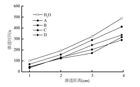 將抑塵劑A、B、C、D分別配制成0.2 wt.%的水溶液,在煤粉NR表面進(jìn)行正向滲透試驗,研究不同抑塵劑滲透煤塵距離1 cm、2 cm、3 cm、4 cm的潤濕能力。