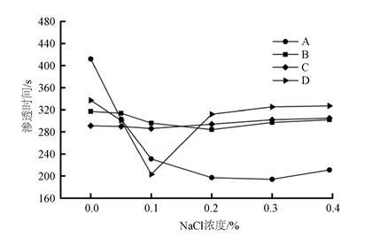 從圖4可知,NaCl對于提高抑塵劑潤濕性能的作用更為顯著。因此,在抑塵劑中加入不同濃度的NaCl,研究無機鹽濃度對煤塵NR的潤濕性能的影響。如圖5所示,少量的NaCl的引入,能夠降低抑塵劑在煤塵表面的滲透時間。NaCl的引入能夠降低抑塵劑溶液的表面張力,使抑塵劑在煤塵表面的接觸角不斷降低[18]。另外,無機鹽能夠增強表面活性物質(zhì)在煤塵表面的吸附能力,降低煤塵與抑塵劑之間的界面能,提高了抑塵劑對煤塵的潤濕性能;煤塵中含有大量的酚羥基、羧基等有機基團(tuán),因此煤塵表面呈現(xiàn)電負(fù)性[19]。當(dāng)NaCl含量持續(xù)增加時,抑塵劑A、B、C在煤塵表面的滲透時間趨于平穩(wěn),而抑塵劑D出現(xiàn)滲透時間增加后平緩的趨勢。相比之下,抑塵劑B、C對于NaCl的敏感程度較低,隨著NaCl含量增加其潤濕能力變化不大;NaCl對抑塵劑A、D在煤塵表面的潤濕能力影響程度較大。