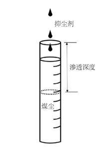 采用正向滲透實驗法研究含有無機鹽的抑塵劑溶液對煤塵浸潤性的影響,如圖1所示。具體步驟為先取1.9克煤粉放入直徑為1 cm、長度為9 cm的無色透明玻璃管中,并用不銹鋼棒將煤塵夯實。配制濃度為0.2 wt.%的抑塵劑溶液,取2毫升該溶液滴入裝好煤塵的玻璃管中,記錄抑塵劑浸潤煤塵高度4 cm時所需要的滲透時間,并且使用下述公式(1)對抑塵劑的潤濕性能進(jìn)行評價[17]。
