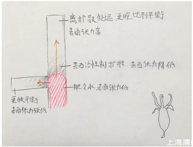 低表面張力的液體滴到高表面張力的液體當(dāng)中,由于表面張力不平衡,就會(huì)帶動(dòng)液體向表面張力高的一邊流動(dòng),這種現(xiàn)象被稱(chēng)為Marangoni效應(yīng)。因?yàn)槲业瘟吮容^多的液體進(jìn)去,藍(lán)色液體前進(jìn)的動(dòng)力肯定不只是表面張力,但這個(gè)因素對(duì)液體“選路”非常重要。