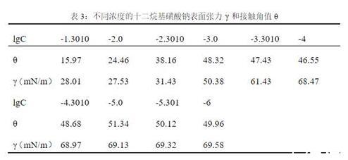 取不同濃度的十二烷基磺酸鈉溶液各25mL,與其濃度相同的枯草菌脂肽鈉溶液25mL混合,使其濃度比約為1。對(duì)混合溶液攪拌,靜止30min,用表面張力儀測(cè)試其表面張力和接觸角。其原始數(shù)據(jù)如下表: