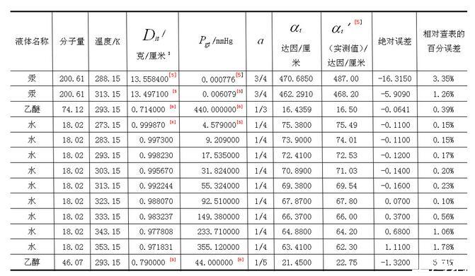 其中N0為阿伏伽德羅數,M為摩爾質量,Dit是液體的密度,Dgt是液體飽和蒸汽的密度,a為與液體種類相關的常量。為驗證(1)式的正確性,對汞、乙醚、水、乙醇等實際液態(tài)物質的表面張力系數進行理論計算,并與實驗實測值'相比較,列于下表【3】: