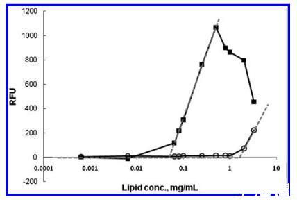圖2.在不同濃度的脂質(zhì)diC8PS下記錄的熒光發(fā)射,范圍從64μg/mL到3.47 mg/mL。在對照中,添加純DMSO代替測試化合物(O),1.1 mg/mL的急劇上升標(biāo)志著diC8PS的CMC。將10μL的10 mM硫利達(dá)嗪(9)引入基質(zhì)(20 mM HEPES緩沖液中的diC8PS),CMC轉(zhuǎn)移到較低濃度(0.042 mg/mL)。RFU:相對熒光單位。