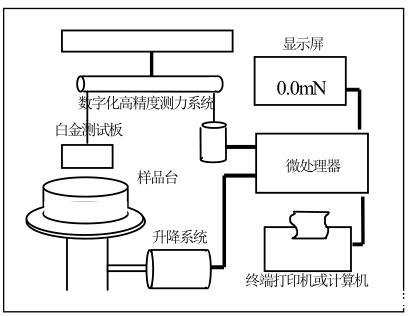 當(dāng)白金板接觸到樣品液后,樣品液的表面張力會將白金板往下拉。基于高精度電子天平的數(shù)字化檢測系統(tǒng)檢測到這個微小的力并傳到微處理機(jī)進(jìn)行處理。