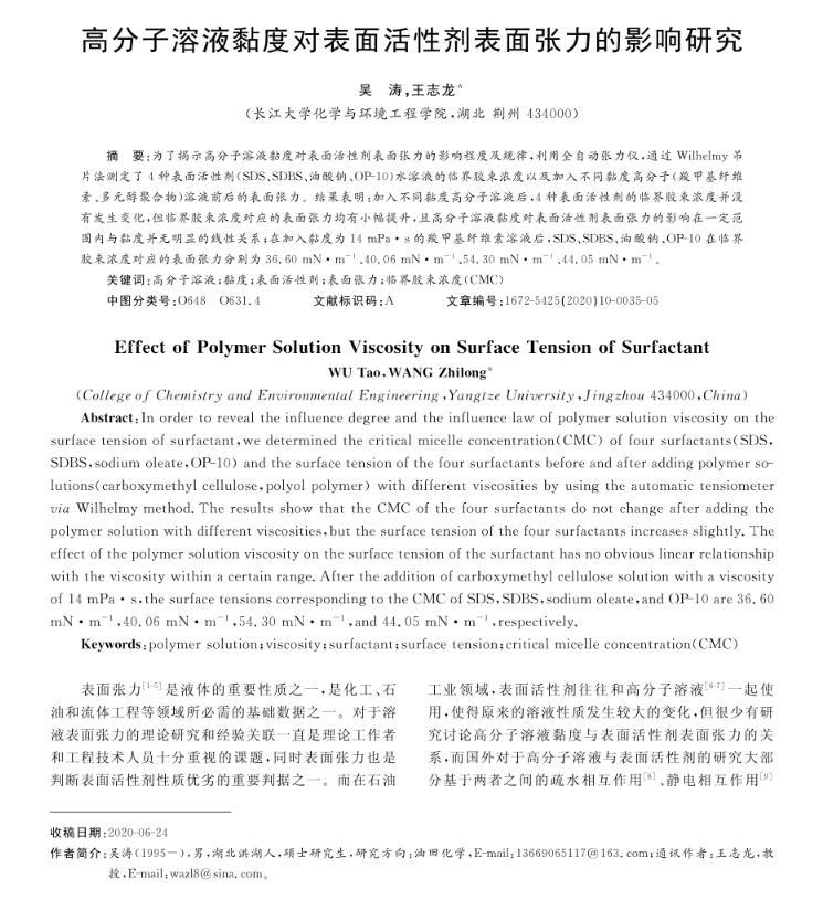 為了揭示高分子溶液黏度對表面活性劑表面張力的影響程度及規(guī)律,利用全自動(dòng)張力儀,通過Wilhelmy吊片法測定了4種表面活性劑(SDS、SDBS、油酸鈉、OP-10)水溶液的臨界膠束濃度以及加入不同黏度高分子(羧甲基纖維素、多元醇聚合物)溶液前后的表面張力。結(jié)果表明:加入不同黏度高分子溶液后,4種表面活性劑的臨界膠束濃度并沒有發(fā)生變化,但臨界膠束濃度對應(yīng)的表面張力均有小幅提升,且高分子溶液黏度對表面活性劑表面張力的影響在一定范圍內(nèi)與黏度并無明顯的線性關(guān)系;在加入黏度為14 mPa·s的羧甲基纖維素溶液后,SDS、SDBS、油酸鈉、OP-10在臨界膠束濃度對應(yīng)的表面張力分別為36.60 mN·m~(-1)、40.06 mN·m~(-1)、54.30 mN·m~(-1)、44.05 mN·m~(-1)。