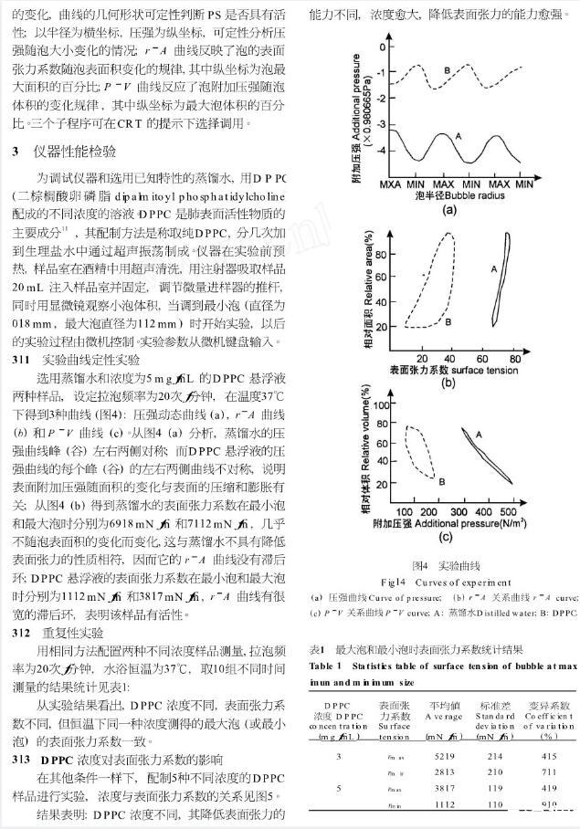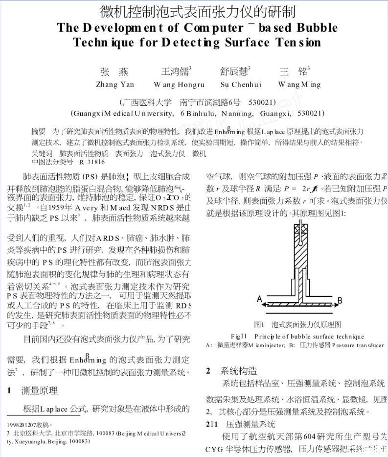 為了研究肺表面活性物質(zhì)表面的物理特性,我們改進(jìn)Enhorning根據(jù)Laplace原理提出的泡式表面張力測(cè)定技術(shù),建立了微機(jī)控制泡式表面張力檢測(cè)系統(tǒng),使實(shí)驗(yàn)周期短,操作簡(jiǎn)單,所得結(jié)果與前人的結(jié)果相符。