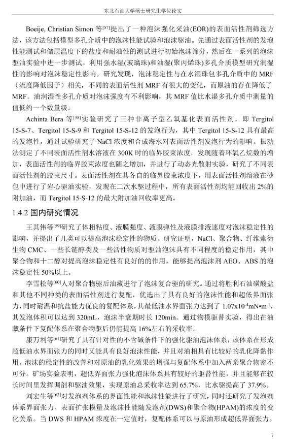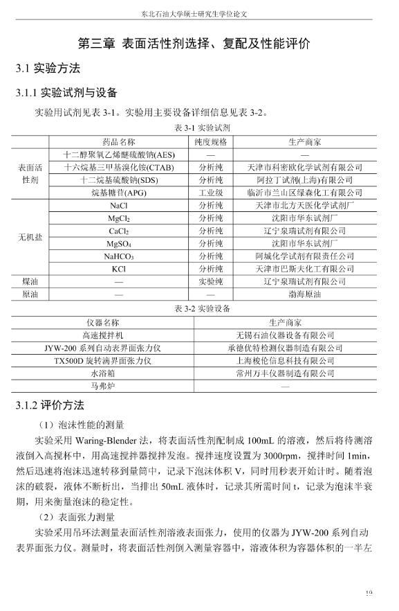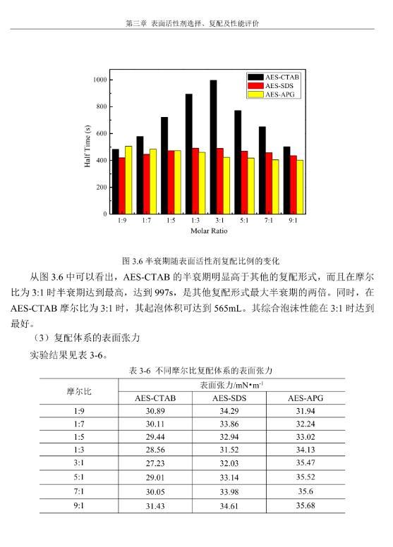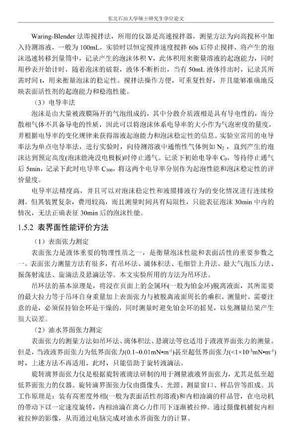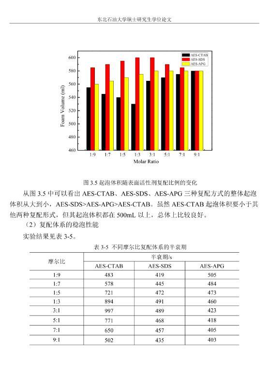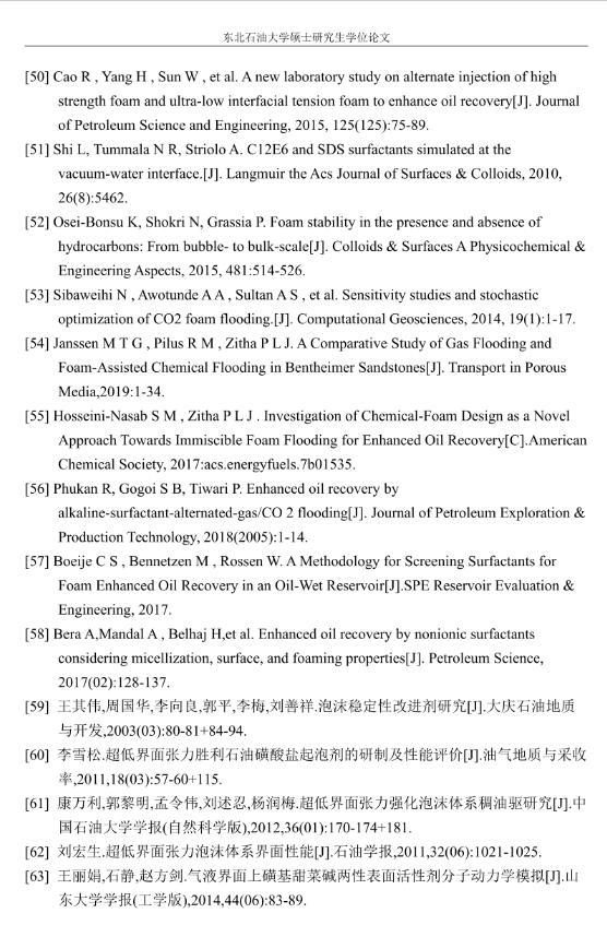 【摘要】:泡沫驅(qū)具有良好的驅(qū)油性能,在提高采收率方面?zhèn)涫荜P(guān)注。在泡沫驅(qū)油過程中,能夠明顯降低注入流體的流度,改善流度比,降低流體的相對(duì)滲透率,延緩注入流體的突破時(shí)間,封堵高滲層的大孔道,改變液流的方向,較好地實(shí)現(xiàn)封堵作用。但泡沫作為一種熱力學(xué)不穩(wěn)定流體,其穩(wěn)定性受許多因素的影響,包括遇油快速消泡、在高溫和高礦化度的情況下極易破裂等,泡沫穩(wěn)定性已成為泡沫驅(qū)油時(shí)亟待解決的問題。另外,用于泡沫驅(qū)的泡沫體系很難兼具超低界面張力和穩(wěn)定泡沫兩種性能,而且文獻(xiàn)報(bào)道對(duì)這方面的研究較少,這為本文提供了一個(gè)新的思路。實(shí)驗(yàn)室合成陰-非離子型表面活性劑十二醇聚氧乙烯醚硫酸鈉(AES)。AES同時(shí)具有陰離子和非離子兩種表面活性劑的性能,具有很好的泡沫性能和表面活性,同時(shí)與其它表面活性劑具有很好的相容性。最終確定的合成條件為:十二醇聚氧乙烯醚和氨基磺酸的摩爾比為1:2,反應(yīng)溫度為95℃,反應(yīng)時(shí)間為60min。在合成AES的基礎(chǔ)上,選擇幾種不同類型的表面活性劑進(jìn)行復(fù)配,優(yōu)選出泡沫性能和表面活性優(yōu)良的體系,進(jìn)行耐溫、耐礦化度及耐油性能的評(píng)價(jià)。實(shí)驗(yàn)采用Waring-Blender法測(cè)量泡沫的起泡體積和半衰期,采用吊環(huán)法和旋轉(zhuǎn)滴法測(cè)量復(fù)配體系的表面張力與油水界面張力。實(shí)驗(yàn)最終優(yōu)選出泡沫性能與表面活性優(yōu)良的AES-CTAB復(fù)配體系,并確定其最佳復(fù)配摩爾比為3:1,最佳總濃度為0.02mol·L-1。復(fù)配體系耐溫200℃,耐質(zhì)量分?jǐn)?shù)20%的原油,礦化度增加可以提高復(fù)配體系的泡沫穩(wěn)定性和表面活性。實(shí)驗(yàn)從氣液比、泡沫注入量和溫度三個(gè)方面對(duì)泡沫提高采收率的影響進(jìn)行研究。最佳氣液比為2:1,最佳泡沫注入量為0.6PV,泡沫采收率隨溫度的提高逐漸下降,在60-100℃范圍內(nèi)泡沫在水驅(qū)后提高采收率在30%以上。