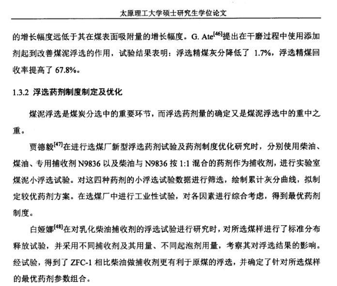 為研究浮選效果與礦漿表面張力之間的關(guān)系,對(duì)-0.5mm的平朔弱粘煤、馬蘭焦煤和晉城無(wú)煙煤進(jìn)行了浮選試驗(yàn),研究表明:煤油或仲辛醇用量適當(dāng)時(shí),隨著藥劑用量的增加,礦漿表面張力降低,可燃體回收率和精煤灰分升高,三者在同一藥劑量時(shí)達(dá)到極值點(diǎn),并在相同的藥劑量范圍內(nèi)維持在極值點(diǎn)附近;煤油或仲辛醇用量過大時(shí),隨著藥劑用量的增加,礦漿表面張力回升,可燃體回收率和精煤灰分回落。這一結(jié)果對(duì)利用礦漿表面張力來指導(dǎo)浮選藥劑制度、協(xié)助在線控制浮選可燃體回收率和精煤灰分有著重要意義。