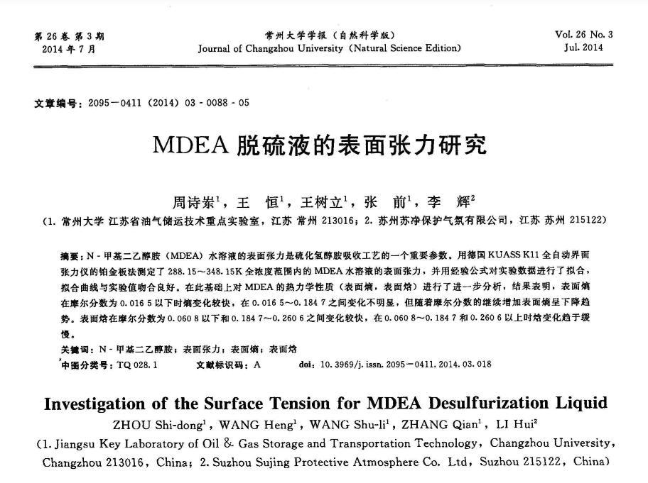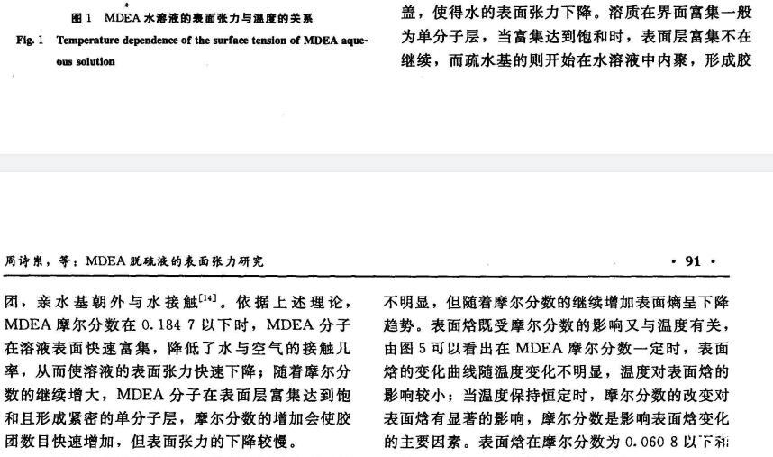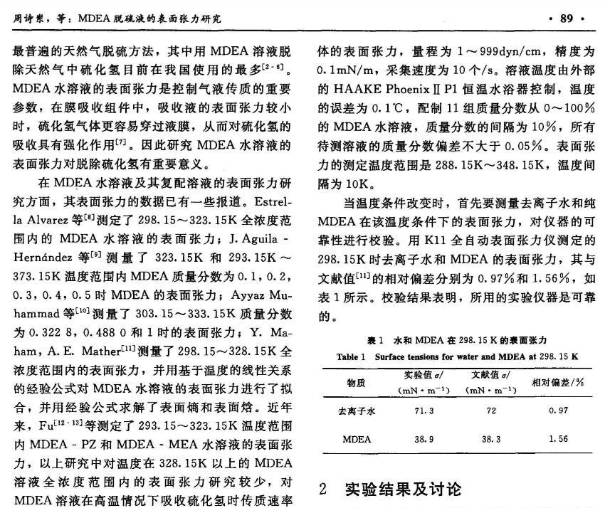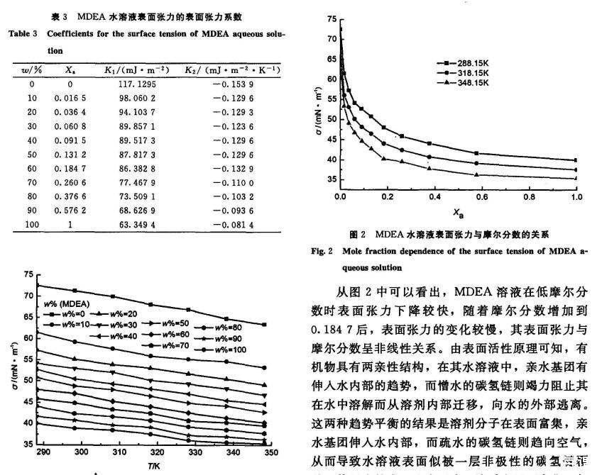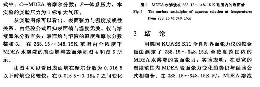 【摘要】:N-甲基二乙醇胺(MDEA)水溶液的表面張力是硫化氫醇胺吸收工藝的一個(gè)重要參數(shù)。用德國KUASS K11全自動(dòng)界面張力儀的鉑金板法測(cè)定了288.15~348.15K全濃度范圍內(nèi)的MDEA水溶液的表面張力,并用經(jīng)驗(yàn)公式對(duì)實(shí)驗(yàn)數(shù)據(jù)進(jìn)行了擬合,擬合曲線與實(shí)驗(yàn)值吻合良好。在此基礎(chǔ)上對(duì)MDEA的熱力學(xué)性質(zhì)(表面熵,表面焓)進(jìn)行了進(jìn)一步分析,結(jié)果表明,表面熵在摩爾分?jǐn)?shù)為0.016 5以下時(shí)熵變化較快,在0.016 5~0.184 7之間變化不明顯,但隨著摩爾分?jǐn)?shù)的繼續(xù)增加表面熵呈下降趨勢(shì)。表面焓在摩爾分?jǐn)?shù)為0.060 8以下和0.184 7~0.260 6之間變化較快,在0.060 8~0.184 7和0.260 6以上時(shí)焓變化趨于緩慢。