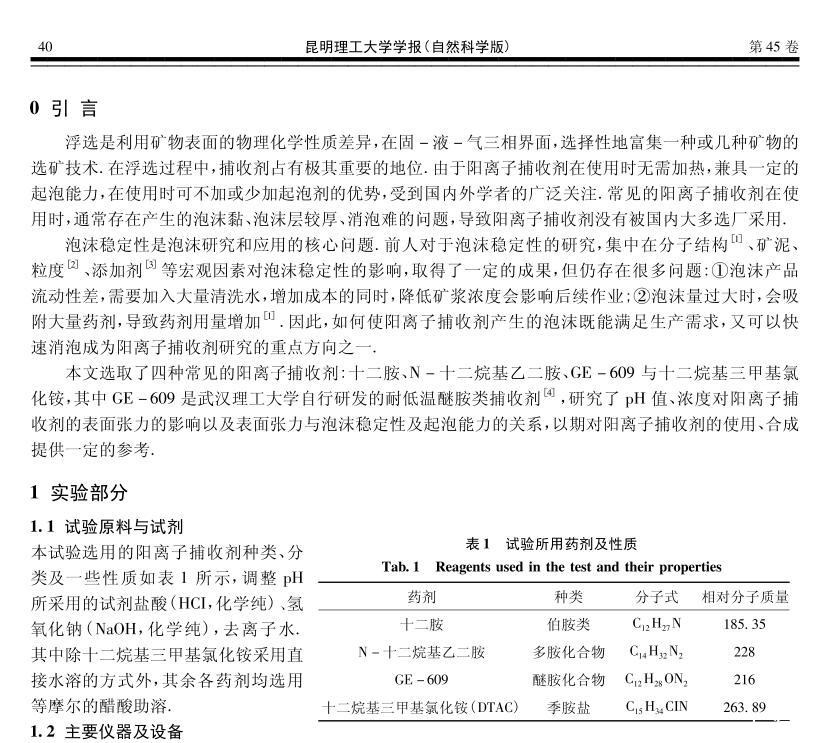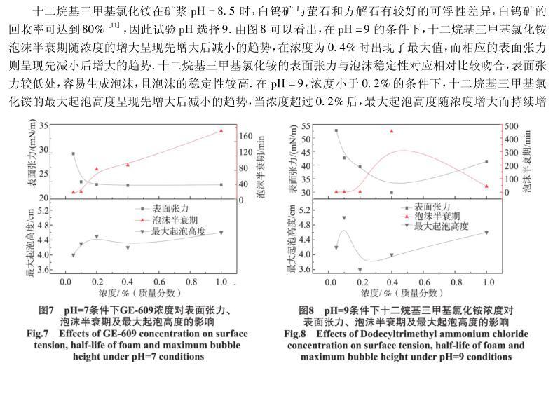 四種陽(yáng)離子捕收劑的起泡性能與表面張力研究