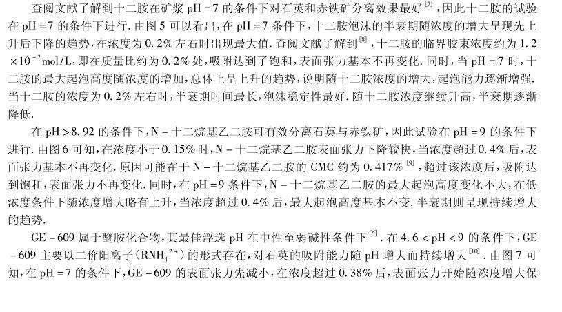 【摘要】:研究了不同pH和濃度對(duì)四種陽(yáng)離子捕收劑表面張力以及起泡性能的影響.通過(guò)控制單因素變量,結(jié)合表面張力以及臨界膠束濃度的相關(guān)理論,采用KRUSS表面張力儀等設(shè)備研究了陽(yáng)離子捕收劑的表面張力與起泡能力、泡沫穩(wěn)定性之間的關(guān)系。結(jié)果表明,pH值對(duì)十二胺、N-十二烷基乙二胺兩種捕收劑的表面張力影響較明顯,對(duì)GE-609(醚胺化合物)及十二烷基三甲基氯化銨的影響較小;濃度對(duì)四種捕收劑的表面張力及泡沫穩(wěn)定性都存在一定的影響,但影響程度不同,對(duì)起泡能力的影響不明顯,但總體呈上升趨勢(shì)。捕收劑的泡沫穩(wěn)定性與表面張力存在一定關(guān)系,當(dāng)濃度小于臨界膠束濃度時(shí),表面張力越大,泡沫穩(wěn)定性越弱,起泡能力隨濃度的變化存在一定波動(dòng),但變化趨勢(shì)與表面張力沒(méi)有直接的對(duì)應(yīng)關(guān)系。