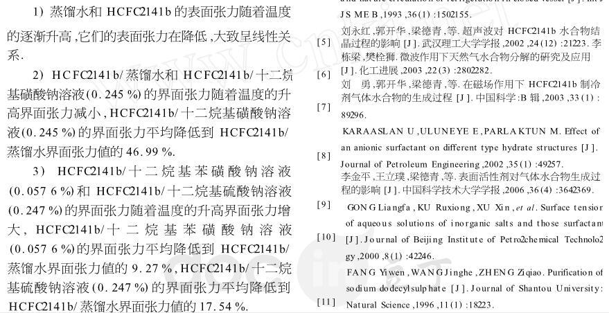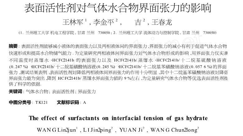 【摘要】:表面活性劑能夠減小液體的表面張力以及兩相液體間的界面張力,界面張力的減小有利于促進氣體水合物快速形成和提高水合物儲氣能力.為定量研究兩相液體間界面張力對氣體水合物形成的影響,用界面張力儀實測不同溫度時蒸餾水、HCFC-141b的表面張力以及HCFC-141b/蒸餾水、HCFC-141b/十二烷基硫酸鈉溶液(0.247%)、HCFC-141b/十二烷基磺酸鈉溶液(0.245%)、HCFC-141b/十二烷基苯磺酸鈉溶液(0.057 6%)的界面張力,測試結(jié)果表明,表面活性劑對降低兩相液體間界面張力的作用十分明顯,其中十二烷基苯磺酸鈉溶液對降低界面張力最為突出,降到HCFC-141b/蒸餾水界面張力值的9%左右,為定量研究氣體水合物等優(yōu)選表面活性劑提供了科學(xué)的依據(jù)。