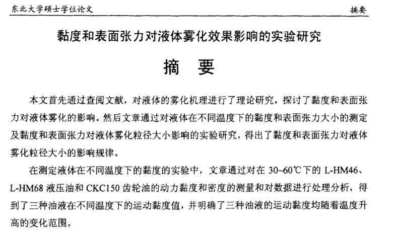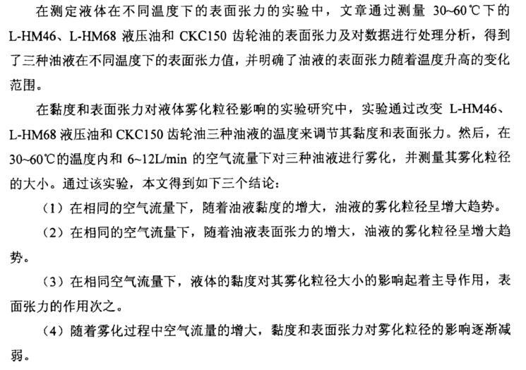 在黏度和表面張力對液體霧化粒徑影響的實驗研究中,實驗通過改變L-HM46、 L-HM68液壓油和CKC150齒輪油三種油液的溫度來調(diào)節(jié)其黏度和表面張力。然后,在30~60℃的溫度內(nèi)和6~12L/min的空氣流量下對三種油液進(jìn)行霧化,并測量其霧化粒徑的大小。通過該實驗,本文得到如下三個結(jié)論: