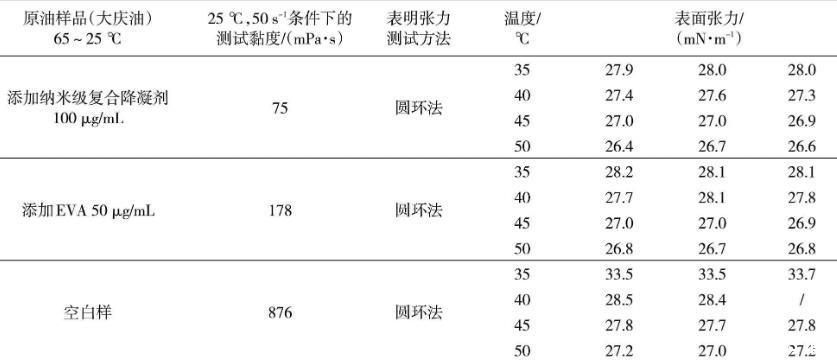 從表1可以看出,處理后添加納米級(jí)復(fù)合降凝劑100μg/mL大慶油樣、添加傳統(tǒng)EVA降凝劑50μg/mL大慶油樣、大慶空白油樣在25℃、50 s-1測(cè)試條件下的黏度是依次升高的,添加納米級(jí)復(fù)合降凝劑100μg/mL的大慶油樣品黏度最低,為75 mPa·s。相同的測(cè)試溫度條件下,黏度越大的油樣表面張力越大。其中,空白油表面張力最大,添加傳統(tǒng)EVA降凝劑的油樣次之,添加納米級(jí)復(fù)合降凝劑的油樣最小。原油油品的表面張力隨著溫度的降低而增大。