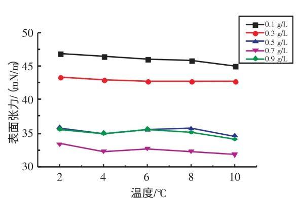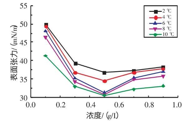 2.2.1不同溫度下十二烷基苯磺酸鈉溶液表面張力與濃度的關(guān)系實驗研究了在溫度為2、4、6、8、10℃條件下,SDBS溶液的表面張力與濃度的關(guān)系(見圖3)。由圖3可知,當濃度在0.1~0.7 g/L時,隨著SDBS溶液濃度的升高,其表面張力逐漸減小;當濃度在0.7~0.9 g/L時,隨著SDBS溶液濃度的升高,其表面張力逐漸增大。當SDBS溶液濃度為0.7 g/L時,其表面張力取得最小值。